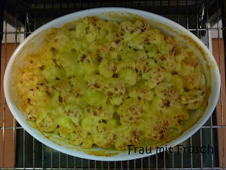 Soße kochen. Dafür 2 EL Butter(schmalz) schmelzen, 2 geh. EL Mehl dazu geben, alles verrühren und mit 750 ml (kaltem, sonst klumpts!) Wasser aufgießen. Aufkochen! Gewürzt wird mit 2 TL Gemüsebrühepulver, etwas Salz und Pfeffer und was einem sonst gerade noch einfällt. (Heute war an meiner Soße Senf, Cayennepfeffer und mildes Paprikapulver. Gut passt – je nach den verwendeten Zutaten – auch etwas Curry, Tomatenmark, ein paar Kräuter, usw.) Die Soße sollte eher mild sein (aber nicht fad!), sonst wird der Auflauf zu würzig!